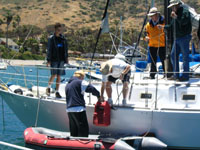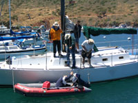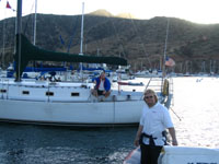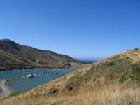 | After such a filling lunch and given a not very warm day we decided to hike over to Catalina Harbor rather than swim around Two Harbors. Harold, Robert, Christian, and RJ hiked all the way to the mouth of Cat Harbor. Lonny, William, Stephen hiked to Cat Harbor, then to the bluff overlooking our boats (see Page 2 for pictures). | ||