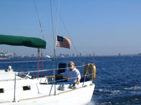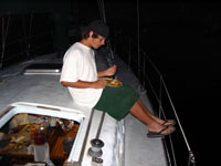 | We all awoke at 6:00 am, had breakfast, and after a few delays left the dock around 7:50 am. On the trip over the crew rotated between helm and lookout. The morning fog had lifted early and we could actually see the island from the Breakwater. Seas were 3-6 foot with the occaisional 8. Winds were approximately 10 knots. This made for a fun trip going over. | ||