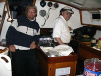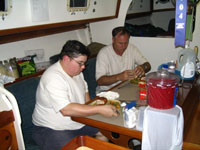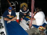 | We combined our resources on dinner: John cooked the Chicken Cordon Bleu on Cheng Ho while Chantey's crew prepared the vegetables. We tied each end of our dinghy to either boat, giving us an easy (and gas efficient) method of moving people and supplies from boat to boat. | ||